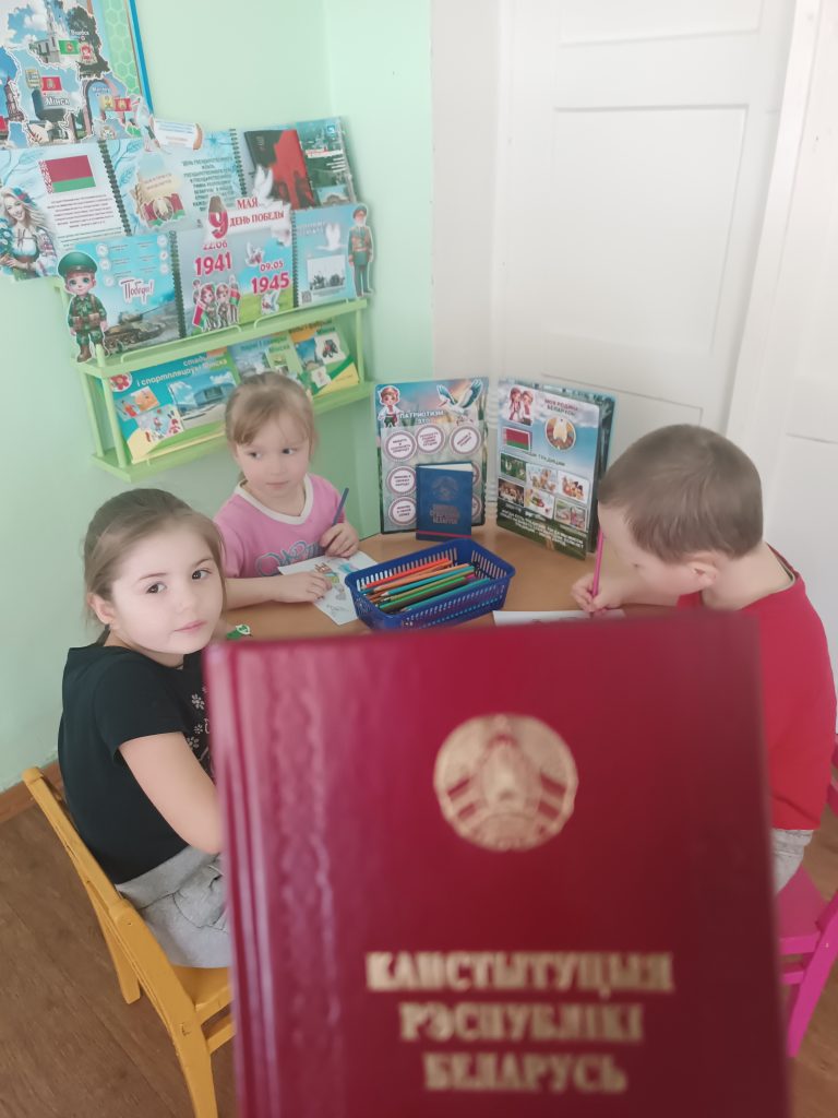 Воспитанники просмотрели презентацию «Конституция Республики Беларусь», где смогли познакомиться с понятиями «закон», «право», повторили государственную символику: флаг, герб, гимн. Были проведены беседы, где дети знакомились с важным документом в их жизни, играли в дидактические игры «Назови области Беларуси», «Покажи на карте Беларусь», «Собери герб», «Собери флаг Республики Беларусь». Воспитанники старшей подгруппы также закрепили знания о том, какие права есть у граждан нашей страны, которые прописаны в Конституции Республики Беларусь.